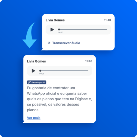 O uso crescente de mensagens de voz no WhatsApp trouxe praticidade para os clientes, mas também desafios para as equipes de atendimento, que precisam ouvir áudios longos e repetir trechos para compreender o contexto. A Transcrição de Áudio da Digisac resolve esse problema convertendo automaticamente mensagens de voz em texto.