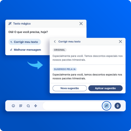 Escrever respostas rápidas, assertivas e no tom adequado pode ser desafiador, especialmente em operações com alto fluxo de mensagens. O Texto Mágico foi criado para simplificar esse processo, oferecendo sugestões de melhorias no texto digitado pelo atendente.
