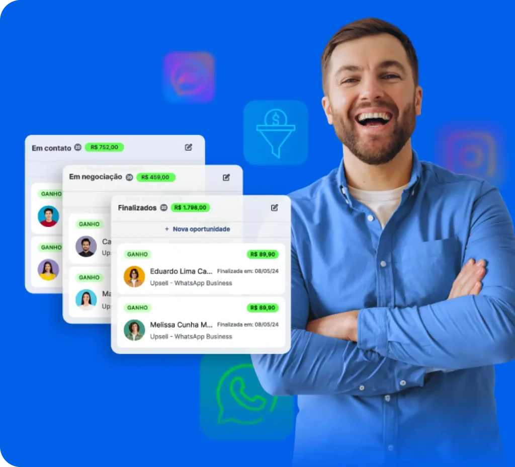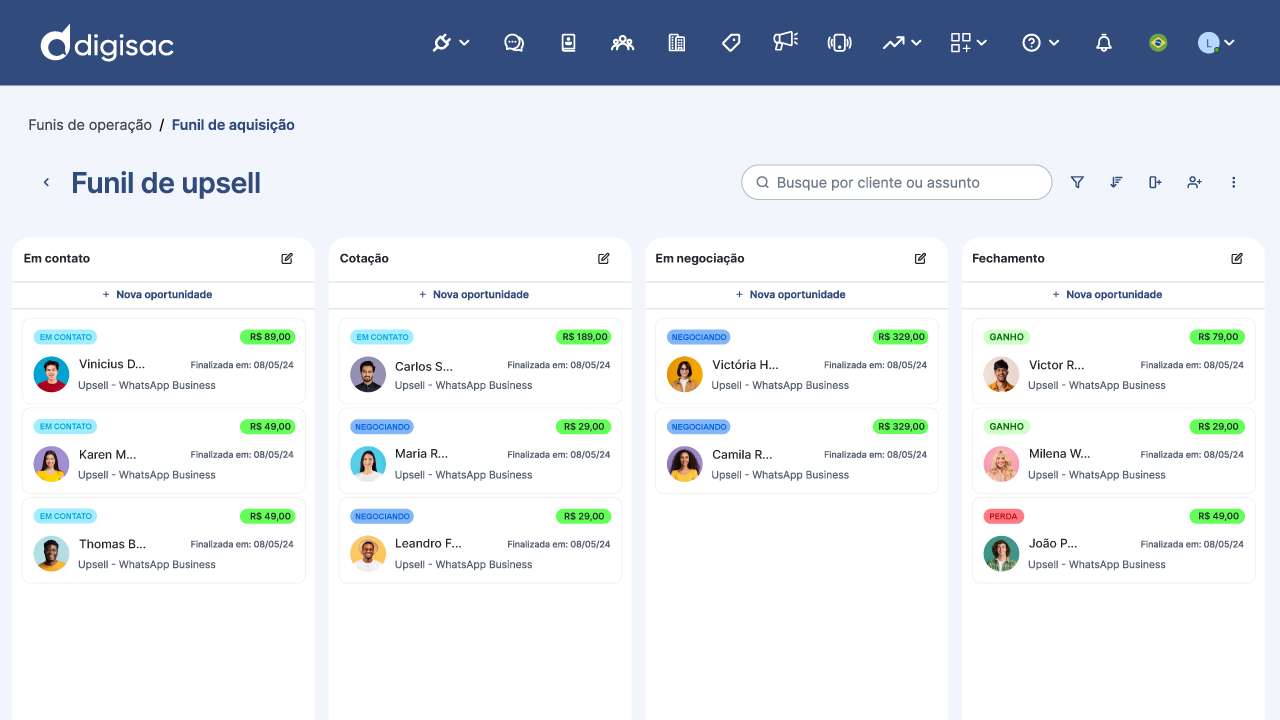 Visualize cada etapa, acompanhe oportunidades conforme elas acontecem e entenda exatamente onde estao as chances reais de gerar receita. Tudo integrado ao atendimento para voce vender mais com muito menos esforco.