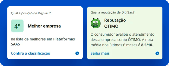 É com esse desempenho que anunciamos nossa mais recente conquista: estamos entre as 4 plataformas SaaS mais bem avaliadas no Reclame Aqui no Brasil – e lideramos o ranking no segmento de atendimento multicanal – sendo o primeiro lugar plataforma de atendimento dentro da categoria Software as a Service.
