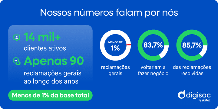 Com mais de 14 mil clientes ativos, a Digisac mantém um histórico sólido de confiança: ao longo dos anos, foram registradas apenas 90 reclamações gerais, um número extremamente baixo diante da nossa base. Os índices de satisfação confirmam essa credibilidade – 83,7% dos clientes afirmam que voltariam a fazer negócio e 85,7% das demandas recebidas foram resolvidas.